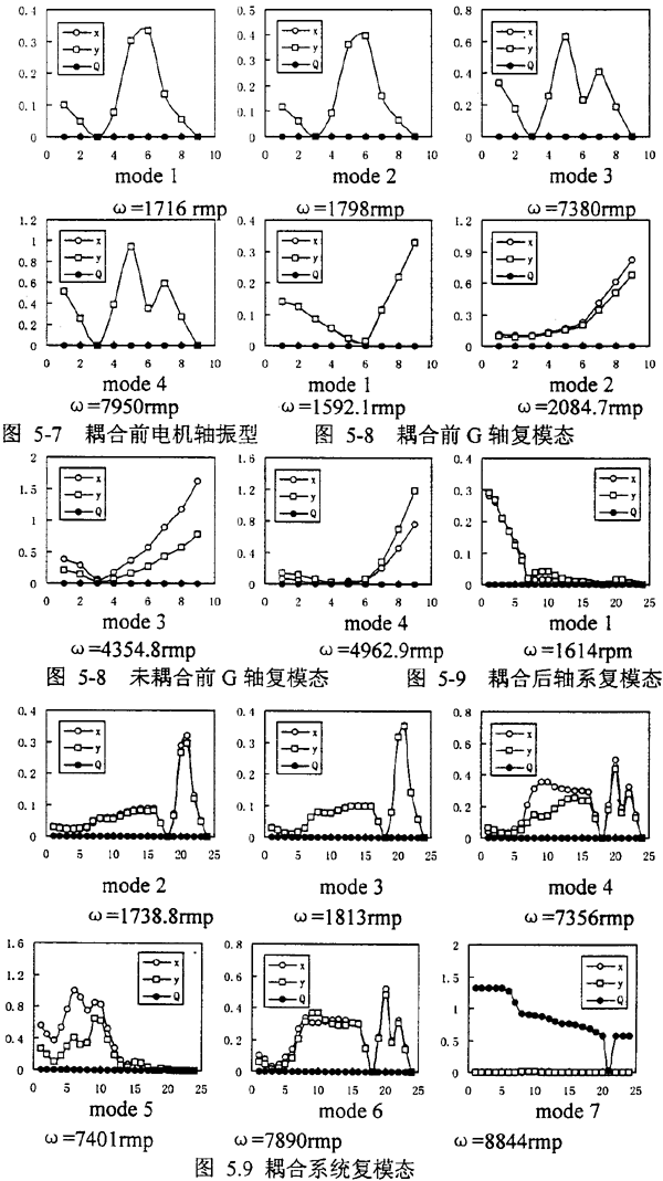G軸和電機軸通過聯(lián)軸器聯(lián)接耦合后,軸系各軸承負荷分配發(fā)生變化,引起軸承工作狀態(tài)的改變,進而影響到整個軸系各跨轉(zhuǎn)子的穩(wěn)定性,從表5-12其中1#軸承負荷減少了60Kg,使用權(quán)得軸承的工作偏心減小,因此系統(tǒng)換轉(zhuǎn)速下降。