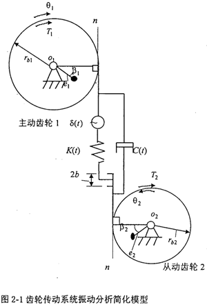 圖2-1中,rb1——主動(dòng)齒輪基圓半徑;rb2——從動(dòng)齒輪基圓半徑;K(t)——齒輪嚙合剛度;e1——主動(dòng)齒輪偏心距;e2——從動(dòng)齒輪偏心距;β1——主動(dòng)齒輪不平衡質(zhì)量的初始角度;β2——從動(dòng)齒輪不平衡質(zhì)量的初始角度;δ(t)——齒輪的綜合誤差;JD1——主動(dòng)齒輪轉(zhuǎn)動(dòng)慣量;JD2——從動(dòng)齒輪轉(zhuǎn)動(dòng)慣量;C(t)——齒輪阻尼系數(shù);b——齒側(cè)間隙;n-n——齒輪嚙合線方向。