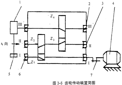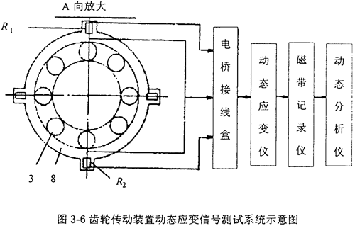 圖3-5是被測(cè)試的齒輪傳動(dòng)裝置傳動(dòng)系統(tǒng)簡(jiǎn)圖,圖3-6是測(cè)試該齒輪傳動(dòng)裝置箱體動(dòng)態(tài)激勵(lì)力應(yīng)變信號(hào)的系統(tǒng)示意圖。零件8為裝在軸承外圈上的套圈。套圈把軸系施加給軸承的載荷分成水平方向和垂直方向再傳給箱體。如圖3-6所示,在套圈的水平和垂直方向分別貼上兩片電阻應(yīng)變片,并分別組成各自的全電橋電路。當(dāng)軸系產(chǎn)生振動(dòng)時(shí),軸承對(duì)箱體的作用力也隨之發(fā)生變化,也使貼在套圈上的應(yīng)變片的電阻值產(chǎn)生變化,而電阻的變化則通過(guò)動(dòng)態(tài)電阻應(yīng)變儀輸出電壓信號(hào),并經(jīng)磁帶記錄儀將此電壓信號(hào)記錄下來(lái)。若將所得的信號(hào)在動(dòng)態(tài)數(shù)字分析儀上進(jìn)行時(shí)域和頻域分析,再經(jīng)過(guò)比較,就可對(duì)齒輪傳動(dòng)裝置內(nèi)的軸系部件的故障作出較為正確的診斷。