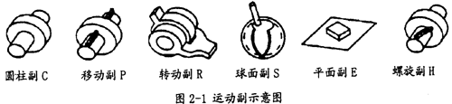 在等角速萬向聯(lián)軸器中,大部分都屬于連桿機構(gòu).最古老的雙聯(lián)十字軸萬向聯(lián)軸器機構(gòu)就是球面四連桿機構(gòu)。從大量的不同的機構(gòu)綜合中,有可能得出多種實用的等角速連桿機構(gòu),所以研究等角速理論,以連桿機構(gòu)的型式和尺度關(guān)系為對象,進行新的等角速理論的探索,在一定的意義上是可行的。在機構(gòu)學(xué)上,構(gòu)件同構(gòu)件間的連接稱為副,其不同的形式和代號如圖2-1所示: