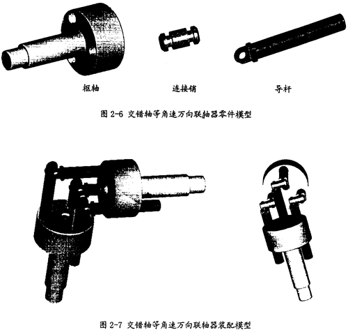 利用圖2-5中的機構(gòu)形式,將其在空間中進行擴展,即可得到一種非常有價值的等角速萬向聯(lián)軸器——RCRCR交錯軸等角速萬向聯(lián)軸器。在圖2-6示意了此種聯(lián)軸器的組成零件模型,在圖2-7中示意了此種聯(lián)軸器的裝配模型,其中左右兩圖分別是從不同的視角得到的視圖。這種聯(lián)軸器在功能上能實現(xiàn)空間交錯軸傳動,它的主要特點是:低副結(jié)構(gòu),耐磨損性好;構(gòu)件形狀簡單,便于制造;允許被聯(lián)接的兩交錯軸的偏移角變動范圍大,甚至可作直角交錯傳動(不考慮構(gòu)件間干涉時)。