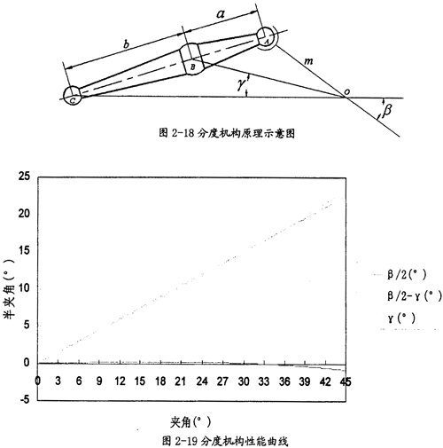 ,γ的函數(shù)圖形,在β角小于36度以前,幾乎是重疊的,在36度以后,才開始有明顯的差異,這一點從它們的差值曲線(圖2-19中下面的紫紅色曲線)也可以看出。這就是說,此機構在目前的尺度下在36度以前,它的分度性能是相當理想的,值得借鑒。不過從分度性能曲線上,可以看出,環(huán)叉式萬向聯(lián)軸器并非是完全的等角速萬向聯(lián)軸器,因為在36度以前的分度也有微小的差異。