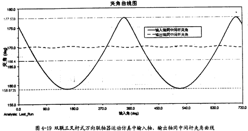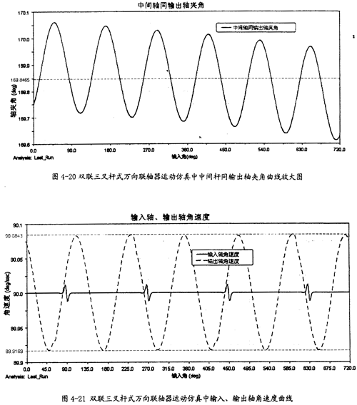 由圖4-20可以看出,中間桿同輸出軸間的夾角變化也呈現(xiàn)一定的規(guī)律,在每-個回轉(zhuǎn)周期中,它的變化頻率為3次。結(jié)合圖4-19、圖4-20可知中間桿同輸入軸及輸出軸夾角的變化頻率是不-樣的,這是雙聯(lián)三叉桿式萬向聯(lián)軸器有別于單聯(lián)三叉桿式萬向聯(lián)軸器的一種特性。