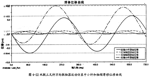 由圖4-22可以看出,雙聯(lián)三叉桿式萬向聯(lián)軸器在運轉(zhuǎn)的過程中,左右兩端的小桿滑移位移量幾乎相等,左右兩端軸頸的滑移位移量也接近等值,且軸頸的滑移位移量比小桿沿滑道滑動的位移量要小得多,這同單聯(lián)三叉桿式萬向聯(lián)軸器的特性是相同的。