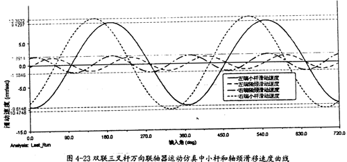 由圖4-23可以看出,雙聯(lián)三叉桿式萬向聯(lián)軸器在運轉(zhuǎn)的過程中,左右兩端的小桿滑移速度幾乎相等,左右兩端軸頸的滑移速度也接近等值,且軸頸的滑移速度比小桿沿滑道滑移速度要小得多,它們的變化頻率同單聯(lián)時的情況相比也無變化,在大小上同β=10°的單聯(lián)三叉桿式萬向聯(lián)軸器的特性是相同的。