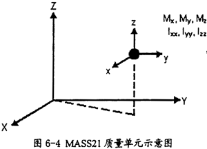 此單元為一個有六自由度的質(zhì)量單元。此單元的第一個不同的坐標(biāo)方向上可以施加不同的質(zhì)量大小和轉(zhuǎn)動慣量。質(zhì)量單元是由單個節(jié)點、單元坐標(biāo)方向的集中質(zhì)量系數(shù)、單元坐標(biāo)軸的旋轉(zhuǎn)慣性所決定的。為了在加入質(zhì)量單元后不影響系統(tǒng)的慣性屬性,在此單元的實常數(shù)設(shè)定中慣性量應(yīng)設(shè)定的非常小(如小于10-4)。單元如圖6-4所示。