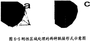 剛性區(qū)域的處理是基于小變形理論,通過這種處理,單個構(gòu)件的自由模態(tài)頻率會上升,只有通過這種處理可以在ADAMS中進行模態(tài)疊加和模態(tài)綜合,得出系統(tǒng)的固有頻率。其處理的方法是根據(jù)構(gòu)件間的不同的運動副連接形式,用點質(zhì)量單元上的節(jié)點(有時物體上自己的節(jié)點也可,不一定非要再建立質(zhì)量單元)和實體上相應(yīng)的節(jié)點進行耦合,形成主節(jié)點和從節(jié)點關(guān)系,構(gòu)成剛性區(qū)域。其連接形式如圖6-5,在此圖的連接形式中,a圖的連接形式可以傳遞所有載荷形式,是一種推薦的連接方式;c圖中主節(jié)點僅同單個從節(jié)點相連傳遞的載荷形式有限,不合適選用。