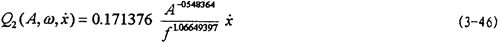 對(duì)于(3-22)模型,我們用阻尼耗能的能量關(guān)系來(lái)辨識(shí)阻尼力與振幅和頻率的關(guān)系。在前面,遲滯回線面積(即阻尼耗能)與振幅的函數(shù)關(guān)系已建立起來(lái),見(jiàn)(3-38)式,而且式中參數(shù)也已辨識(shí)出。同樣,用數(shù)值積分,可以算出振幅一定,頻率變化時(shí)遲滯回線的面積,由此得出遲滯回線面積與頻率的對(duì)應(yīng)關(guān)系,將這些對(duì)應(yīng)關(guān)系畫(huà)成曲線如圖3-6中大圓點(diǎn)曲線所示。由遲滯回線面積隨頻率變化的規(guī)律分析,可建立其函數(shù)關(guān)系為: