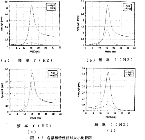 圖6-3(b)表示圓盤振幅Ayc(實(shí)線)與聯(lián)軸器引起的圓盤振幅分量Ayc1(虛線)的相對(duì)大小比較圖。圖6-3(c)表示圓盤振幅Ayc(實(shí)線)與圓盤質(zhì)量偏心引起的圓盤振幅分量Ayc2(虛線)的相對(duì)大小比較圖。圖6-3(d)展示了聯(lián)軸器引起的圓盤振幅分量Ayc1(實(shí)線)與聯(lián)軸器振幅Ayb(虛線)的比較圖。從圖6-3(b)、(c)可知,圓盤偏心質(zhì)量引起的圓盤振動(dòng)位移分量yc2的幅值A(chǔ)yc2(虛線)大于聯(lián)軸器引起的圓盤振動(dòng)位移分量yc1的幅值A(chǔ)yc1(虛線)。從這兩圖中曲線的比較還可以知道,鋼絲繩聯(lián)軸器對(duì)圓盤振幅的影響在不同頻率段效果是不相同的?偟膩碚f,在頻率12.7~18.3赫茲區(qū)域外,聯(lián)軸器對(duì)圓盤振動(dòng)是起減振作用的,這一特性可以從圖6-13(c)清楚地看到。但在此頻率范圍內(nèi),聯(lián)軸器對(duì)圓盤振動(dòng)是增大作用的。