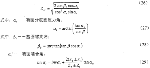 節(jié)點區(qū)域系數(shù)ZH是考慮節(jié)點處齒廓曲率對接觸應(yīng)力的影響,并將分度圓上切向力折算為節(jié)圓上法向力的系數(shù)。ZH數(shù)值可由式(26)計算得出。