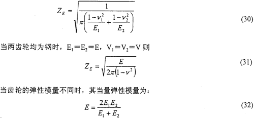 彈性系數(shù)ZE是用以考慮霉?fàn)彈性模量E和泊桑比v對赫茲應(yīng)力的影響。其數(shù)值可按實際材料彈性模量E和泊桑比v由式(30)計算得出。