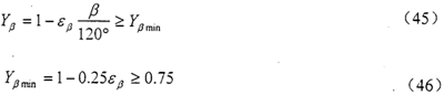 螺旋角系數(shù)Yβ是考慮螺旋角造成的接觸線傾斜對齒根應(yīng)力產(chǎn)生影響的系數(shù)。其數(shù)值可以通過式(45)和(46)計算。