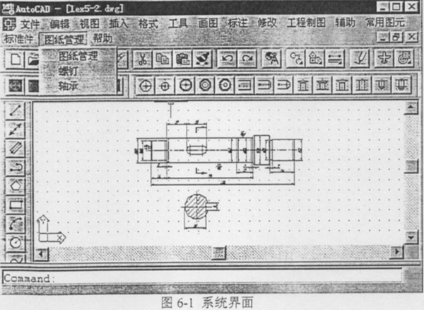 減速機計算機輔助設計、繪圖及圖紙管理系統(tǒng)主要包括MCADDS子系統(tǒng)和減速機CAD子系統(tǒng)二大部分,MCADDS系統(tǒng)是一個相對通用的圖形設計與圖紙管理系統(tǒng),適用于各種機械產(chǎn)品,包括符合國家標準的繪圖平臺、基于事物特性表的通標件庫和面向信息集成的圖紙管理等三個模塊;減速機CAD系統(tǒng)是針對減速機的設計計算開發(fā)的,對零部件具有通用性,包括齒輪嚙合校核、齒輪傳動系統(tǒng)的設計與校核。圖6-1為MCADDS系統(tǒng)界面。該系統(tǒng)的主要內容如下: