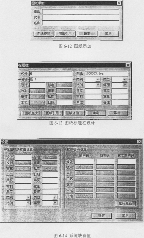 根據(jù)相應(yīng)項的密碼輸入,再選擇/添加/刪除產(chǎn)品,見圖6-10,進行圖紙管理系統(tǒng)的主畫面(見圖6-11),進而對產(chǎn)品選擇、圖紙進行添加、刪除(圖6-12)及其編輯,明細表、標(biāo)題欄的設(shè)計(圖6-13)以及一些系統(tǒng)缺省值(圖6-14)的固定等等;