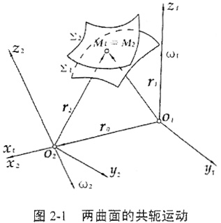 如圖2-1Σ1、Σ2為兩共軛的任意曲面,其中Σ1設(shè)為母曲前,S1(o1x1y1z1)、S2(o2x2y2z2)為兩個(gè)分別與Σ1、Σ2相固連的坐標(biāo)系,r1(1)、r2(2)分別表示Σ1、Σ2上一點(diǎn)的位置矢,N1(1)、N2(2)分別表示曲向Σ1、Σ2上r1(1)、r2(2)兩點(diǎn)處的單位法矢。上述符號(hào)中上標(biāo)表示所定義的坐標(biāo),下標(biāo)表示所屬的曲面。
