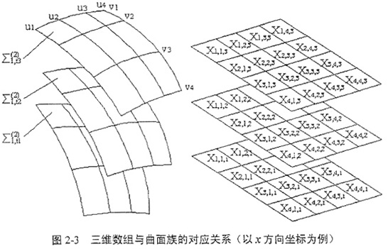 若已知曲面Σ1由一系列離散的坐標(biāo)值表示,則規(guī)則化后的坐標(biāo)值系列可以寫(xiě)成二維數(shù)組成的形式,二維數(shù)組中的各維分別對(duì)應(yīng)u,v參變量或方向,二維數(shù)組中的各元素分別對(duì)應(yīng)曲面上節(jié)點(diǎn)的坐標(biāo);那么,曲面Σ1在坐標(biāo)S2中運(yùn)動(dòng)形成的曲面族{Σ1}可以用三維數(shù)組表示,三維數(shù)組的各維分別對(duì)應(yīng)u,v,t參變量或方向,并且曲面族中的各點(diǎn)與此三維數(shù)組的各個(gè)元素在空間結(jié)構(gòu)上是——對(duì)應(yīng)的,如圖2-3所示。