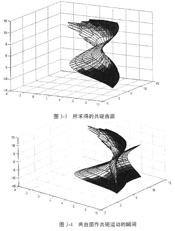求出共軛曲面各節(jié)點坐標值后,調(diào)用MATLAB繪圖命令就可以顯示共軛曲面的圖形,并通過編制的程序,還能夠以動畫的形式演示兩曲面作共軛運動的過程。求得的共軛曲面及兩曲面作共軛運動的瞬間分別如圖3-3、圖3-4所示: