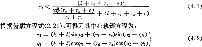 由上面可知,用數(shù)控加工齒廓時,應(yīng)求出圓插刀中心的軌跡,它是被加工內(nèi)齒圈齒廓曲線的內(nèi)法向等距線,如圖4.3所示。圓插刀的半徑可不等于實際推桿減速器中滾子的半徑,只要刀具半徑Td小于內(nèi)齒圈齒廓在齒根部的最小曲率半徑,在加工過程中不會發(fā)生切削干涉即可。對于激波器為偏心圓的推桿減速器,根據(jù)(2.35)式,可得不發(fā)生切削干涉的條件為: