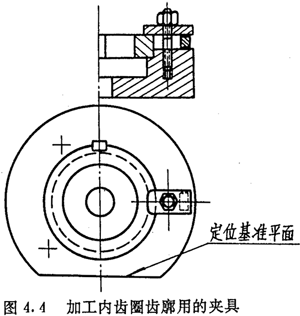 內(nèi)齒圈齒廓的數(shù)控加工,是在齒圈外徑及兩端面都精加工后進行的,因此,應(yīng)以端面及外徑作為定位基準(zhǔn)。其夾具可做成螺釘壓板結(jié)構(gòu),如圖4.4所示。夾具內(nèi)徑應(yīng)盡量接近齒圈外徑,用千分表以夾具內(nèi)圓為基準(zhǔn)找正工作臺軸心。