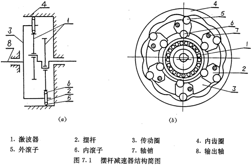 文獻(xiàn)只提出了擺桿活齒傳動的一般結(jié)構(gòu)方案,要把這種方案變?yōu)閷嶋H產(chǎn)品,還有許多理論問題需要解決。例如對機構(gòu)傳動特性的分析,效率計算,強度校核,以及內(nèi)齒圈齒廓的測量等等。本章從擺桿減速器的傳動原理著手,對這些問題進(jìn)行了詳細(xì)的分析討論,為擺桿減速器的制造奠定了理論基礎(chǔ)。