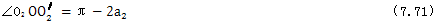 假設(shè)激波器從圖7.2(a)所示初始位置按逆時針方向旋轉(zhuǎn)到使OO2與圖7.2(b)中OO2長度相等的位置,如圖7.10所示,此時圖7.10中的OO1也應(yīng)與圖7.2(b)中的OO1相等,從而圖7.10中的φ1A、φ1B應(yīng)分別與圖7.2(b)中的φ1A、φ1B相等。由圖7.10可得激波器反向轉(zhuǎn)角φ1K為: