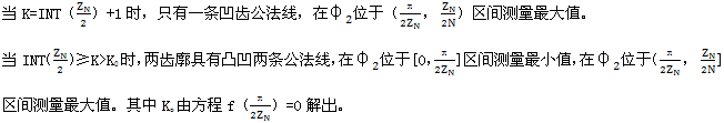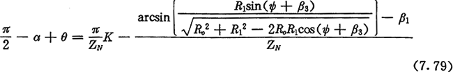 由式(7.71)及式(7.73)可得齒廓AB上與跨槽數(shù)為K的齒郭具有公法線的點(diǎn)的條件式為: