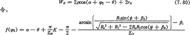 用選代法解方程(7.79),可得到齒廓AB上與跨槽數(shù)為K的齒廓A′B′具有公法線的點(diǎn)P所對應(yīng)的外滾子位置角φ2,從而可行公法線長度WK為: