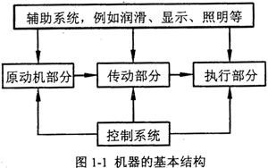 機器的發(fā)展經(jīng)歷了一個由簡單到復雜的過程,人類為滿足生產(chǎn)及生活的需要,設計和制造出了種類繁多、功能各異的機器。機器類型多種多樣,基本結構可以歸結為如圖1-l所示。機器的功能各異,所要求的運動形式千變?nèi)f化,并且需要克服的阻力、阻力矩也因機器工作情況而異。一般說來,原動機的運動形式、運動及動力參數(shù)都是有限的,而且是確定的。這樣必須解決把原動機的運動形式、運動及動力參數(shù)轉變?yōu)閳?zhí)行部分所需的運動形式、運動及動力參數(shù)的問題。這就必須靠機器的傳動部分來完成,即機器中的傳動部分是機器為完成各種功能所必需的基本構成。