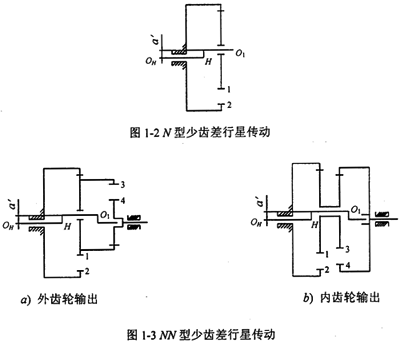 本文所研究的三環(huán)減速機傳動屬于漸開線少齒差傳動,故有必要對漸開線少齒差傳動進行深入的探討。對于標準漸開線內(nèi)嚙合行星齒輪傳動,當其中心內(nèi)齒輪2和行星外齒輪l的齒數(shù)差小于8時,即zp=z2-z1<8(z2=78~200),則該內(nèi)嚙合齒輪副就會產(chǎn)生過渡曲線干涉和齒廓重迭干涉。為了避免內(nèi)嚙合齒輪傳動的各種干涉,可以采取變位的內(nèi)嚙合齒輪傳動,但是采取變位齒輪傳動要保證內(nèi)、外齒輪的齒頂不得變尖,要有足夠的厚度。漸開線少齒差行星傳動,就是由齒數(shù)差很小(一般zp=1~4)的漸開線內(nèi)嚙合變位齒輪副組成的K-H-V(N)型傳動或ZK-H(NN)型傳動。中心輪代號K,轉臂代號H,輸出構件代號V。N型少齒差傳動示意圖如圖1-2所示,圖中1為行星外齒輪,2為中心內(nèi)齒輪,H為輸入軸,又稱為轉臂。行星輪1裝在有偏心距a′的輸入軸上,當輸入軸旋轉時,行星輪不僅繞其安裝在H上的軸線O1轉動,且同時隨著H繞著固定的軸線OH回轉,即行星輪的軸線O1在半徑等于偏心距的a′一個圓周上運動;NN型少齒差行星傳動示意圖如圖1-3所示,內(nèi)齒輪2固定不動,H為輸入軸,又是轉臂,行星輪1和3是一個整體,裝在有偏心距a′的輸入軸H上,當輸入軸旋轉時,行星輪不僅繞其安裝在H上的軸線O1轉動,并且同時隨H繞著固定的軸線OH回轉,然后通過齒輪3帶動齒輪4轉動,而齒輪4與輸出軸固定在一起,把運動輸出。