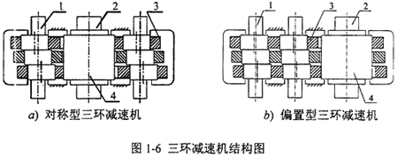 由于三環(huán)減速機(jī)的研究歷史較短,作為一種新生事物,它的發(fā)展道路也必定是曲折的。我國生產(chǎn)的三環(huán)減速機(jī)的結(jié)構(gòu)如圖1-6所示,a)是對稱型三環(huán)減速機(jī),b)是偏置型三環(huán)減速機(jī),三環(huán)減速機(jī)由兩根高速偏心輸入軸1,低速輸出軸2,三片為齒環(huán)板3和外齒輪4構(gòu)成。三片內(nèi)齒環(huán)板3偏心安裝在兩根高速軸1上,它們都與外齒輪4相嚙合,外齒輪4安裝在輸出軸上,各軸均平行配置,利用三相并列平行雙曲柄機(jī)構(gòu)來克服死點(diǎn)。雙曲柄機(jī)構(gòu)的最大缺點(diǎn)就是存在死點(diǎn)位置,即當(dāng)曲柄與連桿共線時,機(jī)構(gòu)處于運(yùn)動不確定位置,此時傳動角為零,機(jī)構(gòu)無法運(yùn)動,因此必須采取雙曲柄軸動力輸入、多相并列雙曲柄機(jī)構(gòu)和多曲柄機(jī)構(gòu)來克服死點(diǎn)。
