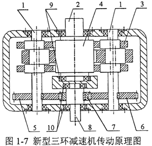 本文對三環(huán)減速機(jī)的平衡、均載減振方面進(jìn)行了深入細(xì)致的研究,并在此基礎(chǔ)上,提出慣性力、慣性力偶矩理論上完全平衡的兩級三環(huán)減速器一中間環(huán)板的厚度是兩側(cè)環(huán)板厚度的兩倍,并且它們偏心之間的相位差為180°;它的傳動原理如圖1-7所示,三環(huán)減速器二級傳動由兩根高速偏心輸入軸1,低速輸出軸2,三片內(nèi)齒環(huán)板3和外齒輪4構(gòu)成。為了克服偏心輸入軸的死點(diǎn)位置和增大傳動比和降低二級輸入軸的轉(zhuǎn)速,一級傳動采用分流定軸齒輪5、6分別帶動兩個偏心輸入軸,而齒輪5、6則由一級輸入軸上的主動齒輪7帶動。三個內(nèi)齒環(huán)板都與外齒輪4相嚙合。在三環(huán)減速器的輸出軸2以及一級輸入軸8的軸承外圈和軸承座孔之間裝有輸出軸彈性均載環(huán)9和輸入軸彈性均載環(huán)10,彈性均載環(huán)的變形使輸出軸和一級輸入軸上的外齒輪浮動,補(bǔ)償制造安裝誤差和傳動變形,從而實(shí)現(xiàn)三環(huán)減速器的均載和減振。對未加裝均載裝置的兩級三環(huán)減速機(jī)(以下簡稱原型機(jī))和加裝均載裝置的兩級三環(huán)減速機(jī)(以下簡稱改進(jìn)型機(jī))進(jìn)行傳動性能、受力性能、均載和減振實(shí)驗(yàn),驗(yàn)證均載和減振效果,證實(shí)本文的三環(huán)減速機(jī)的優(yōu)越性。