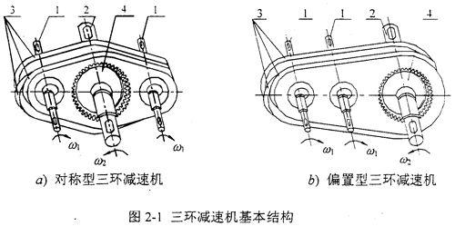 三環(huán)減速機是在普通減速機技術(shù)的基礎(chǔ)上,為適應現(xiàn)代機械設(shè)備對傳動機構(gòu)的要求而開發(fā)的一種新型傳動裝置。三環(huán)減速機的基本結(jié)構(gòu)如圖2一1所示,a)是對稱型三環(huán)減速機傳動,b)是偏置型三環(huán)減速機傳動。它由兩根高速偏心輸入軸1、低速輸出軸2、三片內(nèi)齒環(huán)板3和輸出外齒輪4構(gòu)成。三片內(nèi)齒環(huán)板3偏心安裝在兩根高速輸入軸1上,為了平衡內(nèi)齒環(huán)板的慣性力和慣性力偶矩,兩側(cè)環(huán)板與中間環(huán)板偏心之間的相位差為180°,且中間環(huán)板的厚度為兩側(cè)環(huán)板厚度的兩倍,它們都與外齒輪4相嚙合。外齒輪4安裝在低速輸出軸2上,各軸均平行配置,可以單獨或同時傳輸動力。在本文研究的三環(huán)減速機中,為了克服死點及降低高速偏心軸的轉(zhuǎn)速,采用兩級傳動實現(xiàn)雙軸驅(qū)動,帶動三片內(nèi)齒環(huán)板作曲線平動,每片內(nèi)齒環(huán)板都相當于一相平行四邊形雙曲柄機構(gòu)的連桿,環(huán)板上每一點的軌跡都是以偏心軸的偏心距為半徑的圓。兩側(cè)環(huán)板與中間環(huán)板以180°圓心角的間隔與外齒輪相嚙合,形成大速比,通過輸出軸傳遞運動和轉(zhuǎn)矩。