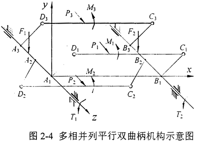 三環(huán)減速機由于其原理的獨特性,引起了人們的廣泛關(guān)注。為了便于進一步研究這種傳動形式,解決實際應用中的各種問題,因此有必要對這種新型傳動形式的受力情況進行研究。本章主要求解本文提出的兩級三環(huán)減速機的二級少齒差傳動部分的受力。三環(huán)減速機采用三相并列平行雙曲柄機構(gòu)一一種自由度小于1的過約束機構(gòu),屬于超靜定問題,機構(gòu)受力無法用平面剛體力學方法完全確定,必須建立變形協(xié)調(diào)條件補充受力方程,才能求解機構(gòu)受力。為此,本章首先進行了三環(huán)減速機的運動分析和機構(gòu)分析,然后根據(jù)結(jié)構(gòu)力學求解超靜定問題的位移法,結(jié)合三環(huán)減速機的傳動特性,提出了相應的變形協(xié)調(diào)條件,建立了對稱A型、對稱B型、偏置型三環(huán)減速機和星型減速機內(nèi)齒環(huán)板的受力分析模型,分別求解四種形式機構(gòu)的受力,并且分析比較了在相同的傳動技術(shù)參數(shù)條件下,不同形式的三環(huán)減速機的受力性能。