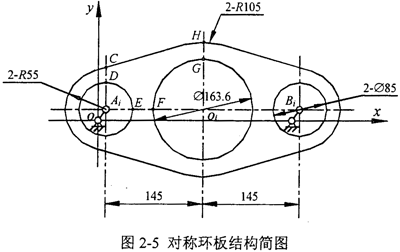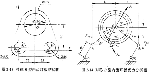 對稱B型三環(huán)減速機的一塊環(huán)板的結(jié)構(gòu)如圖2-13所示,它的受力情況和坐標系選取如圖2-14所示,符號的標定及含義同對稱A型三環(huán)減速機。