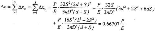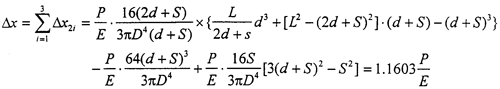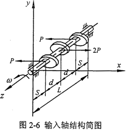 對于三環(huán)減速機輸入軸來說,結(jié)構(gòu)及受載情況如圖2-6所示,其中軸有效長度L=116mm,d=30.5mm,S=27.5mm,輸入軸直徑D=25mm,如果環(huán)板所受載荷為P,則兩側(cè)環(huán)板處輸入軸在x方向的撓度△x為三個撓度的疊加: