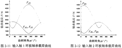 L=145mm,Z1=42,Z2=44,m=3.5mm,α=20°,α′=37.356°,T=875N·m。n=1440r/min,b1=19mm,b2=38mm。則兩輸入軸的偏心軸頸上的環(huán)板軸承載荷FAi、FBi隨輸入曲柄轉(zhuǎn)角φ變化的曲線如圖2-11、2-12所示。