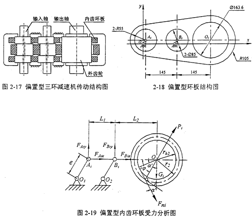 星型少齒差減速機(jī)雖然只有一片內(nèi)齒環(huán)板,結(jié)構(gòu)簡(jiǎn)單,易于滿足傳力條件和裝配條件。但是它的環(huán)板軸承所受載荷在傳遞相同的輸出扭矩的情況下比對(duì)稱型、偏置型三環(huán)減速機(jī)大很多,環(huán)板及其軸承較易損壞,在設(shè)計(jì)和實(shí)際使用中應(yīng)避免采用這種結(jié)構(gòu)布置形式。