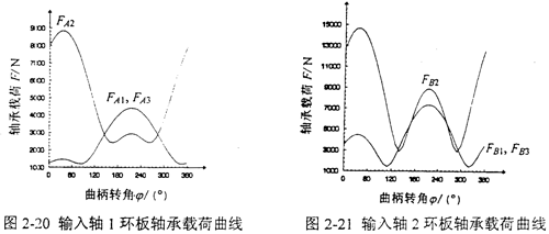 L1=145mm,L2=145mm,Z1=42,Z2=44,m=3.5mm,α=20°,α′=37.356°,T=875N·m,n=1440r/min,b1=19mm,b2=38mm。則兩輸入軸的偏心軸頸上的環(huán)板軸承載荷FAi、FBi隨輸入曲柄轉(zhuǎn)角φ變化的曲線如圖2-20、2-21所示。