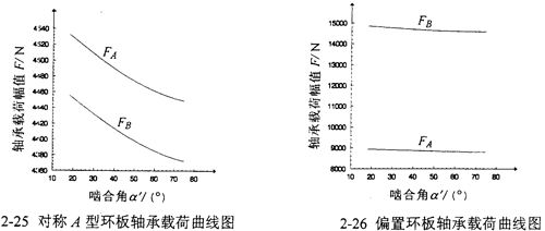 嚙合角α′是三環(huán)減速機(jī)內(nèi)嚙合傳動(dòng)的重要參數(shù),由嚙合角的變化而引起的環(huán)板軸承載荷的變化規(guī)律可以得到某些重要結(jié)論。環(huán)板軸承載荷幅值隨嚙合角變化的曲線如圖2-25、2-26所示。