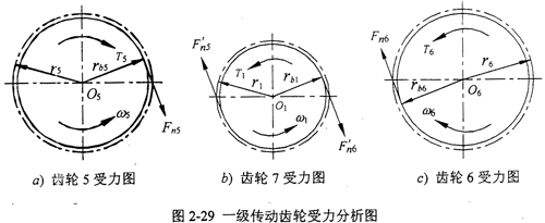 一級(jí)傳動(dòng)齒輪受力分析如圖2-29所示,a)、b)、c)分別為分流齒輪5、主動(dòng)齒輪7、分流齒輪6受力分析圖,二級(jí)傳動(dòng)傳比