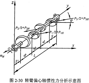 一級(jí)輸出二級(jí)輸入軸上的慣性力大小及方向如圖2-30所示,假設(shè)慣性力與x軸正向所成的角度為φ,則轉(zhuǎn)臂偏心軸上的慣性力矢量和為: