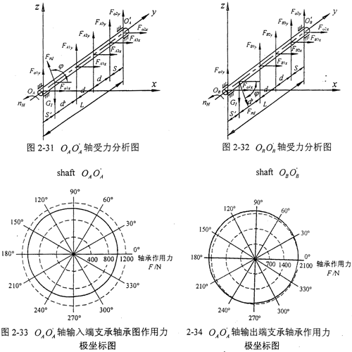 由2.3.3分析可知:當(dāng)求得環(huán)板上的軸承作用力FAix、FAiy,F(xiàn)Bix、FBiy后,通過(guò)輸入軸和支承軸的受力分析,不難求得箱體上各軸承的作用力。兩根一級(jí)輸出二級(jí)輸入軸的受力分析如圖2-31、2-32所示。