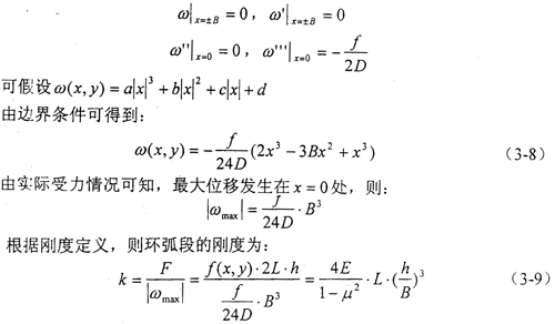 上式為兩端固支的環(huán)弧段剛度的計(jì)算公式,如將支承邊界條件改為一端簡(jiǎn)支和一端固支或兩端簡(jiǎn)支,則相應(yīng)的環(huán)弧段剛度為兩端固支剛度75%或50%。由式(3-8)可知,彈性均載環(huán)的厚度對(duì)其剛度的影響最大;在彈性均載環(huán)平均直徑一定時(shí),凸臺(tái)尺寸及承載寬度對(duì)其剛度有一定影響。