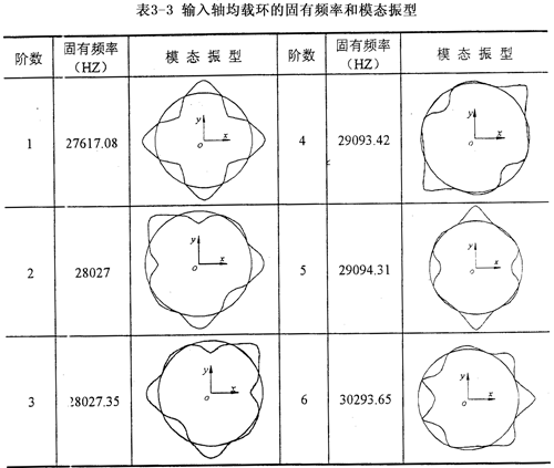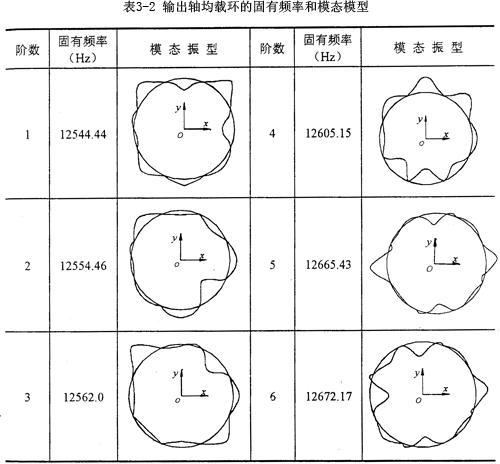 本文利用I-DEAS軟件來(lái)進(jìn)行彈性均載環(huán)的動(dòng)力學(xué)分析。首先求解均載環(huán)的固有特性問(wèn)題,在圖3-14所示的均載環(huán)的力學(xué)模型中,均載環(huán)的邊界條件取為均載環(huán)的八個(gè)外凸臺(tái)固支,輸出軸均載環(huán)和輸入軸均載環(huán)的有限元模型參數(shù)同3.5.3,中研究的一致。應(yīng)用Model草藥Solution模塊中的Model response部分,選用Normal Mode Dynalnics-SVI(普通模態(tài)動(dòng)力分析——同步矢量迭代法)方法求得輸出軸均載環(huán)和輸入軸均載環(huán)的前六階固有頻率和模態(tài)振型分別如表3-2、3-3所示。
