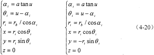 在I-DEAS軟件建模模塊中,已經(jīng)給出一個(gè)變量u,它的缺省取值范圍為u∈(0,1),根據(jù)壓力角的實(shí)際取值范圍,可以將其設(shè)為u=tanαi,則輪齒漸開線的參數(shù)方程可以寫成: