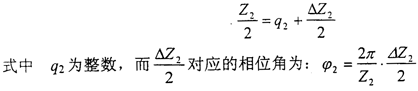 下面來分析它的裝配條件,由于本文提出的新型三環(huán)減速機(jī)環(huán)板相互之間的相位差為180°,所以在分析時(shí),可以只分析兩塊環(huán)板的裝配情況。圖4-19所示為裝配條件分析圖,在兩塊環(huán)板的偏心所構(gòu)成的π角內(nèi),外齒輪1的齒數(shù)為: