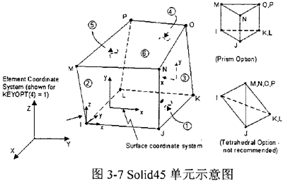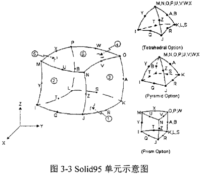 根據(jù)問題的性質(zhì)和模型的復雜程度,選用Solid95單元(見圖3-3)。該單元是三維的20個節(jié)點的結(jié)構(gòu)單元,可以在保證計算精度的前提下允許實體中不規(guī)則的形狀存在。每個節(jié)點存在三個自由度:X、Y和Z方向的移動,可應用于塑性、脆性、大變形和大應變等問題。