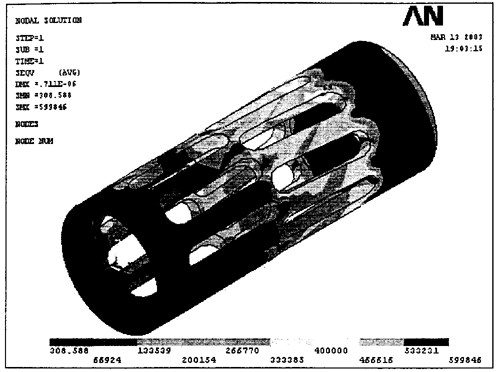 3.3.2.1 活齒架的強度分析 采用平臺為Pentium IV 1.7GHz CPU 、128MDDR SDRAM內(nèi)存、NVIDIA Geforce2 MX/MX4OO顯卡、Windows XP操作系統(tǒng)和ANSYS5.7 軟件進行分析求解。