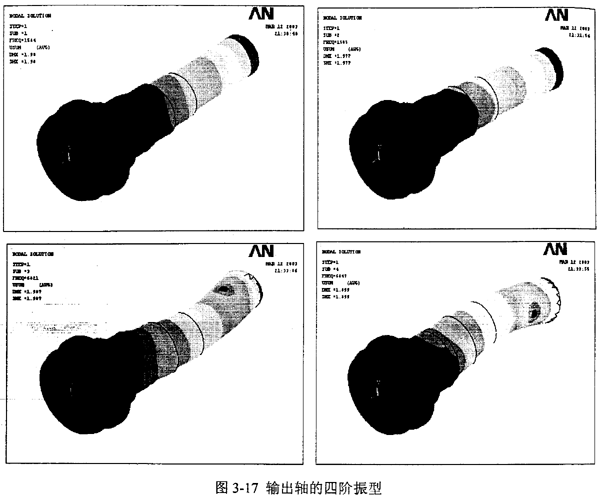 同樣劃分網(wǎng)格并施加約束的輸出軸見(jiàn)圖3-16。求得輸出軸的前四階固有頻率為1584Hz、1585Hz、682lHz、6847Hz,對(duì)應(yīng)的各振型見(jiàn)圖3-17。
