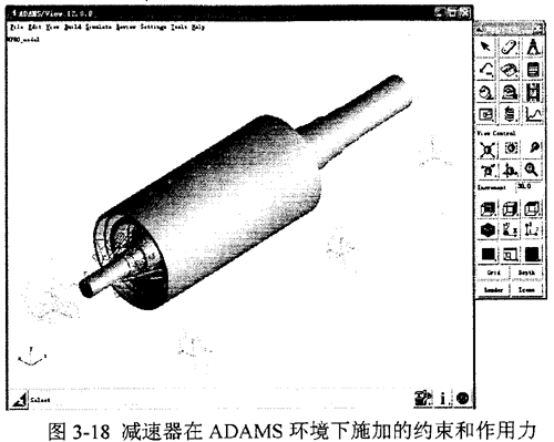將Pro/ENGINEER建立起來(lái)的減速器三維裝配實(shí)體模型通過(guò)Mechpro接口程序?qū)階DAMS,對(duì)其添加約束和作用力情況見(jiàn)圖3-18,其中: